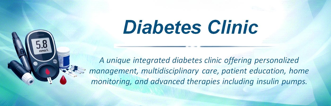 This unique clinic adopts a holistic approach to diabetes management and brings together a multidisciplinary team comprising endocrinologists, diabetes educators, dietitians, and physiotherapists. Comprehensive care is provided with emphasis on diet, exercise, lifestyle modification, and pharmacological therapy. In addition, specialized foot care services are offered in collaboration with general surgeons and orthopaedic specialists.