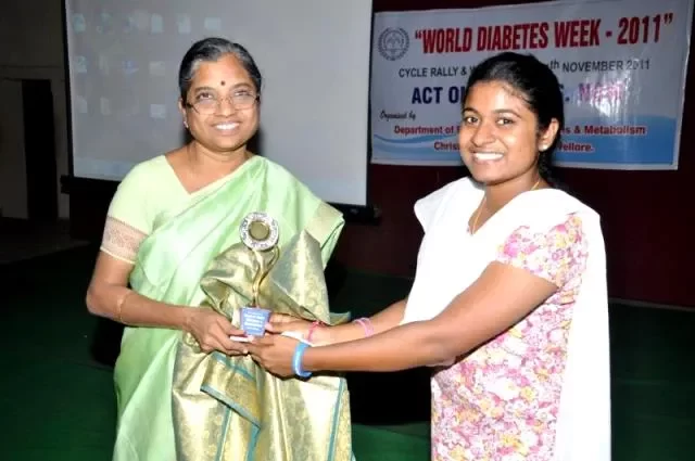 The World Diabetes Month valedictory function and song and dance competition, organised by the Department of Endocrinology, Diabetes and Metabolism was held on December 10, 2011 at Hotel Darling Residency. Dr. Jason Baker, an endocrinologist from Weil-Cornell University (New York) and Mrs. Esther Rita, one of CMC’s first young Type 1 diabetes mellitus patients, spoke about their experiences of` living with diabetes. The chief guest for the evening, Professor Daniel Ezhilarasu, former Principal of Voorhees College, asserted that educational institutions can play a major role in the health care development of their students. Dr. Punitha Ezhilarasu, Professor and Head of Continuing Nursing Education was also present on the occasion. Over 20 schools and colleges participated in the song and dance competition.