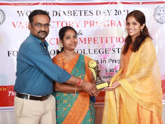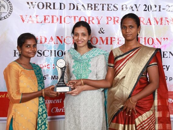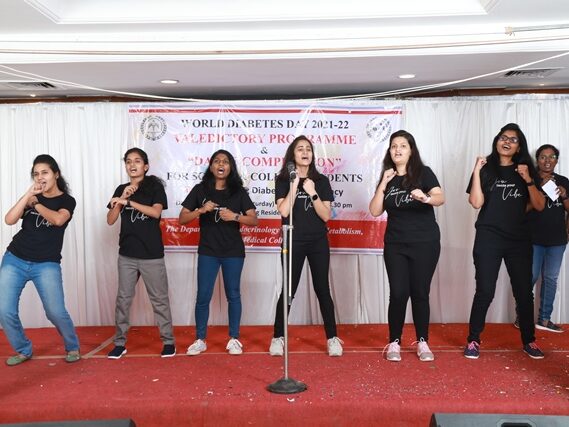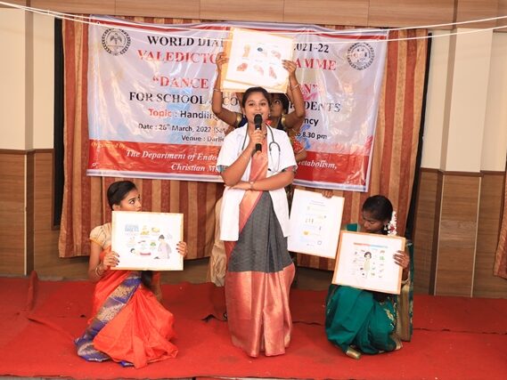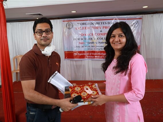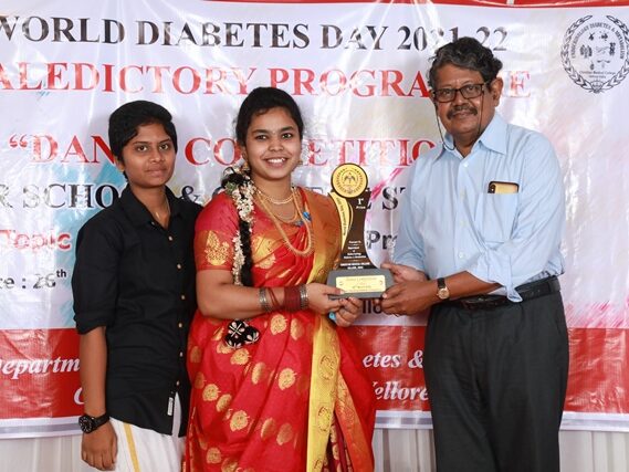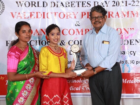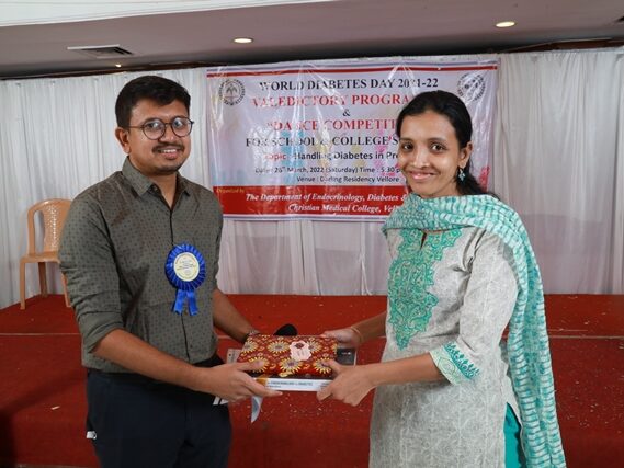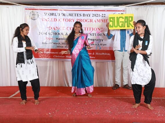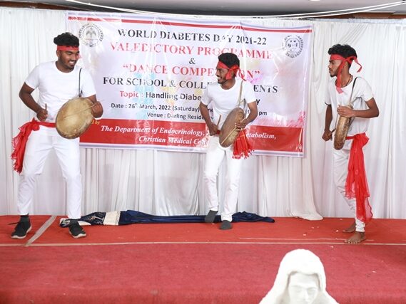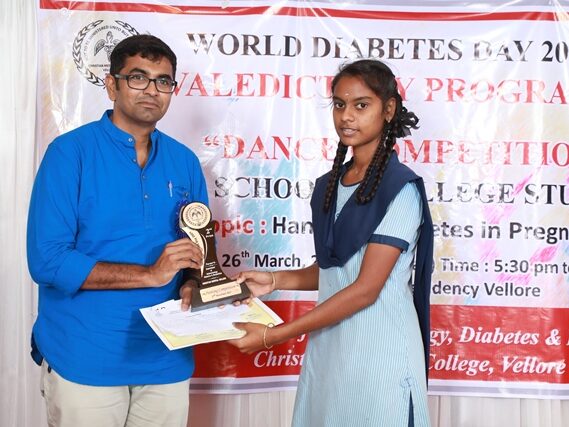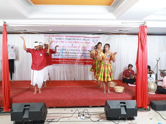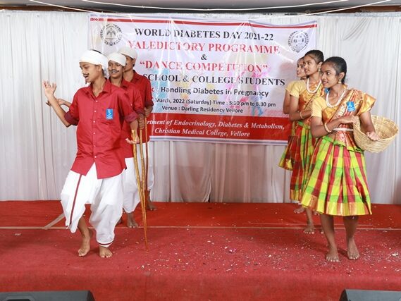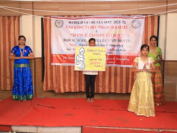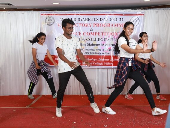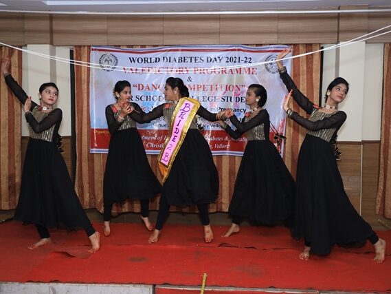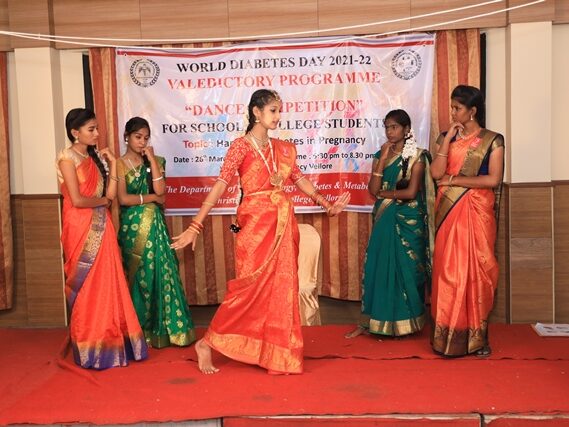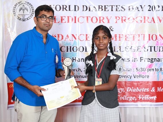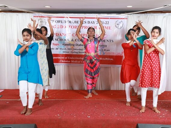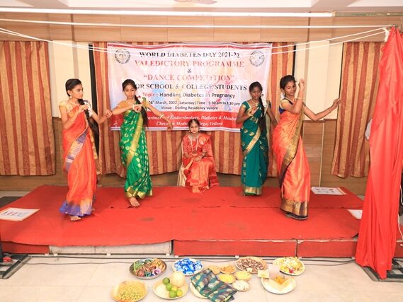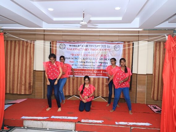 In commemoration of the World Diabetes Day 2021-220, the Department of Endocrinology, Diabetes & Metabolism at CMC has conducted a series of events namely Cookery Competition, Nursing Quiz, Medi Quiz, Painting competition, Teacher’s Quiz, Poster Competition, Slogan competition, Video clipping competition, and Self Composed Dance competition targeted towards school and college students around Vellore city from October 2021 to March 2022. In appreciation of a tremendous support we got from the people, we organized a Self-Composed Dance Competition for School & College Students Titled : Handling Diabetes in Pregnancy, at Darling Residency on 26th March, 2022, followed by a Valediction programme.