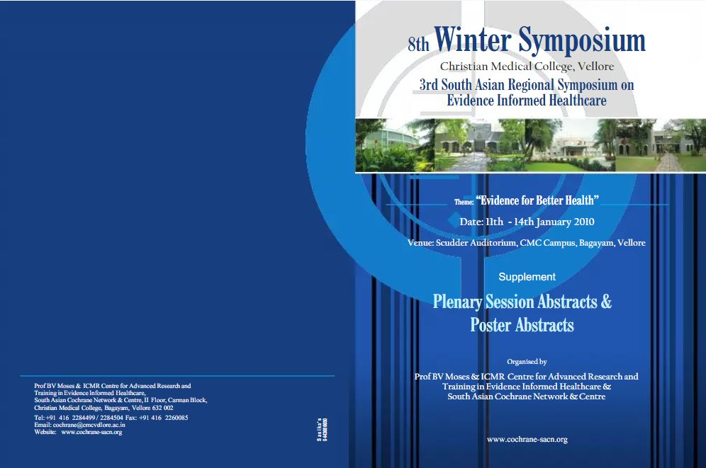 The 8th Winter Symposium of the Christian Medical College and the 3rd South Asian Regional Sympoisum on Evidence Informed Health Care was held from January 11 -14, 2010 with the theme 'Evidence for Better Health'. The Symposium was organised by the Prof. B.V. Moses and ICMR Centre for Advanced Research and Training in Evidence Informed Healthcare and the South Asian Cochrane Network and Centre. The main focus of the Symposium was to discuss ways in which to generate and use reliable and relevant evidence to inform healthcare in India.