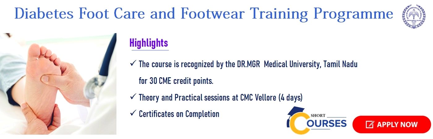 The Department of Endocrinology, Diabetes and Metabolism will be organizing a Foot Care and Footwear Training Programme for Doctors, Nurses and Physiotherapist from 30th January, 2024 to 2nd January, 2024, with practical and theoretical intonation followed by assessment. This Training will take place at the Christian Medical College in Vellore.