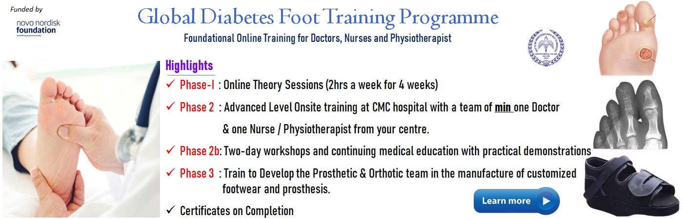 Foundational Online training for Doctors, Nurses, and Physiotherapists on the judicious management of the diabetic foot and utilization of footwear. The course is hosted on the CMC Endo training portal, participants will receive unique login credentials to access the same. The training sessions will be conducted online, via Zoom, by experts in the respective areas. (2 hours a week for 4 weeks).