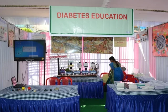 A total of 628 General public were screened for diabetes at free of cost. The Departments of Cardiology, Ophthalmology, Physiotherapy, Prosthetic &Orthotic Services and Dietary, along with Department of Endocrinology, Diabetes & Metabolism had put up stalls which displayed awareness and knowledge about diabetes and its complications, the scope to prevent it. Free blood tests to detect diabetes mellitus and free foot examination for person with diabetes in the exhibition.